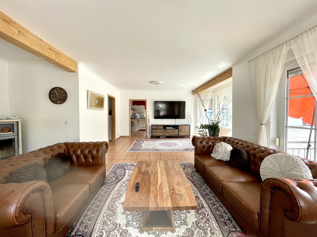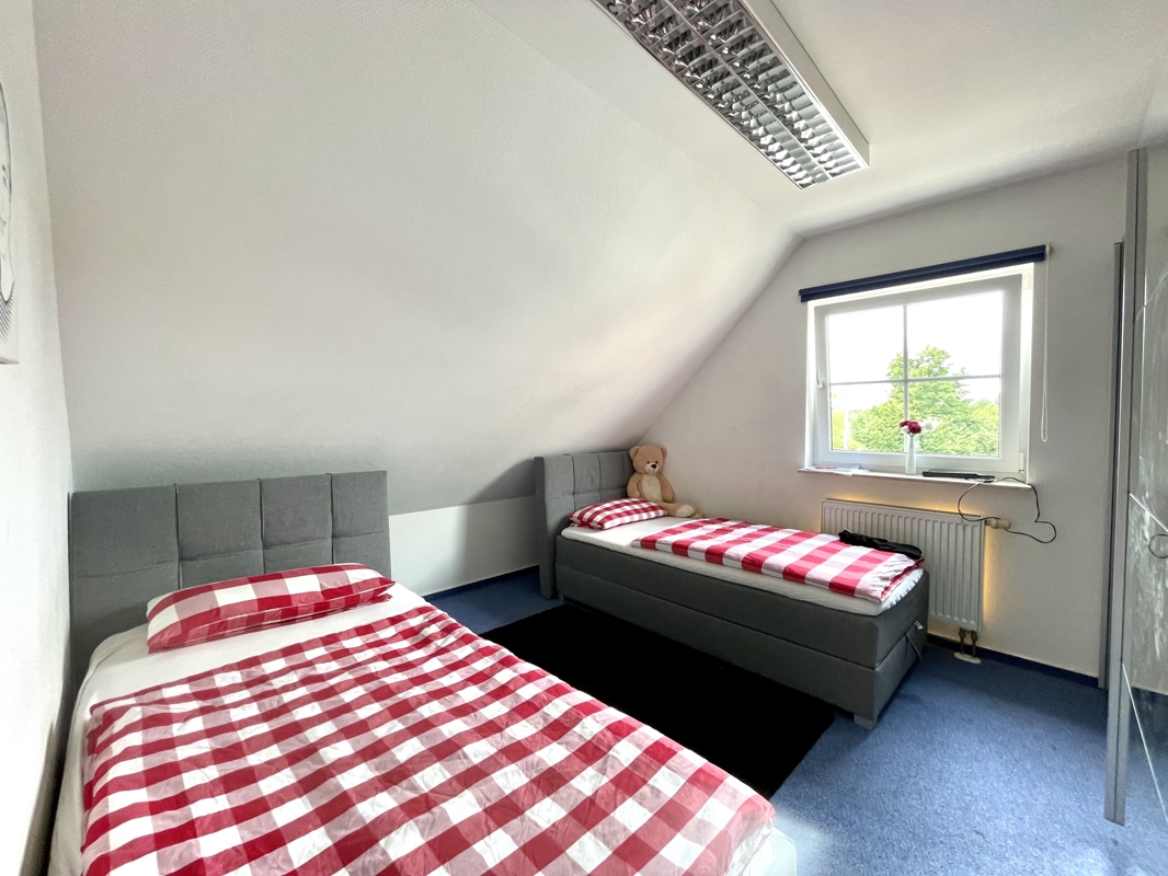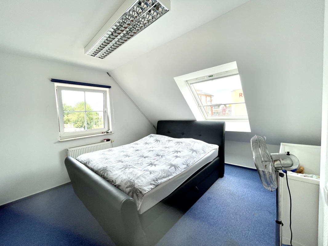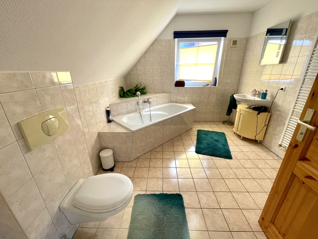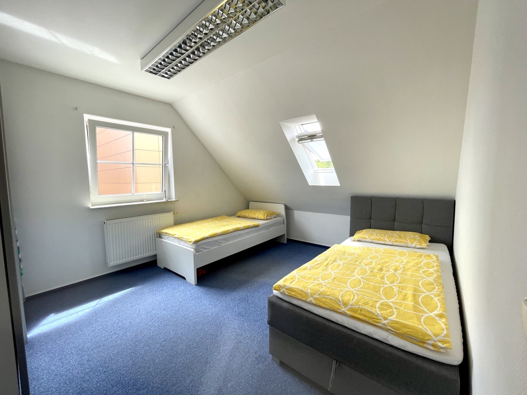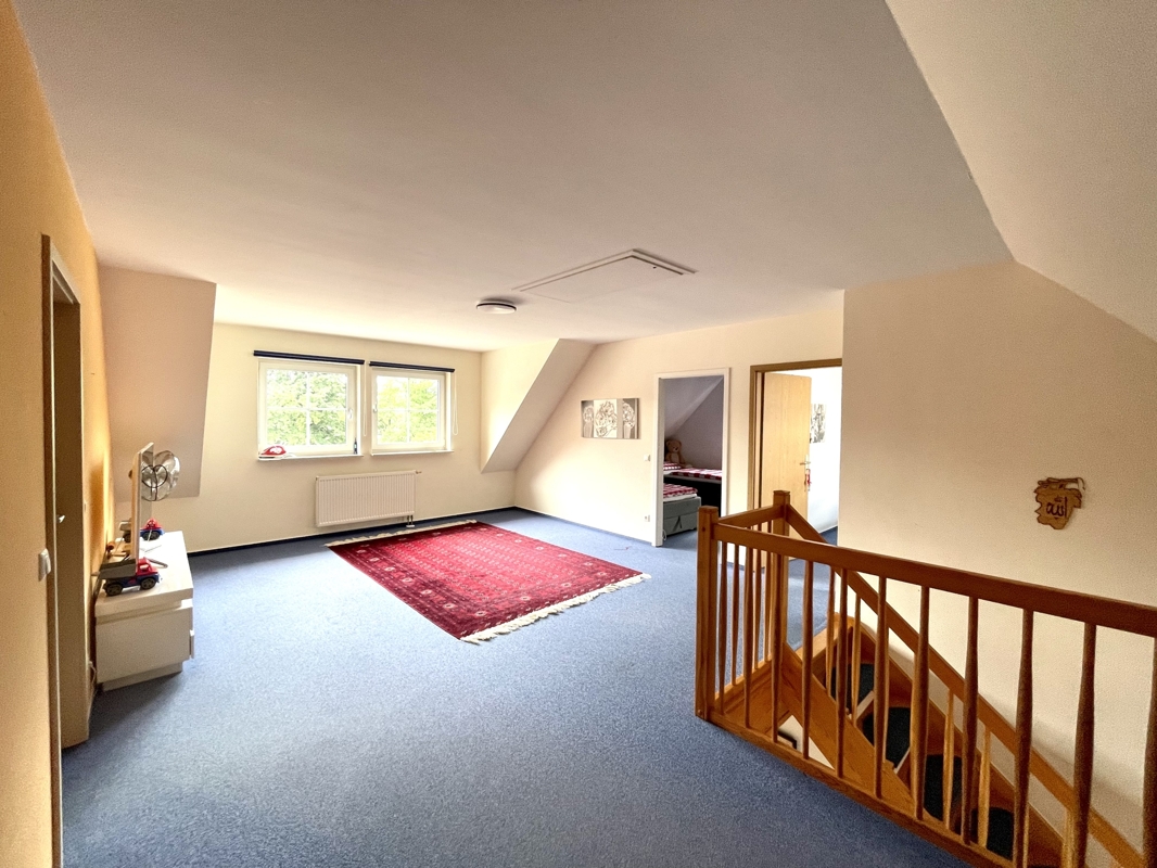 Im Obergeschoss gelangen Sie über einen stattlichen und offenen Gemeinschafts- oder Aufenthaltsbereich zu drei weiteren Zimmern/Büros zur flexiblen Nutzung und einem Tageslichtbadezimmer mit Dusche und Wanne. Durch den Einbau von Dachgauben kann hier weitere Nutzfläche gewonnen und die vorhandene Substanz erweitert werden - weiteres Potenzial liegt im aktuell unverbauten Spitzboden des Gebäudes.