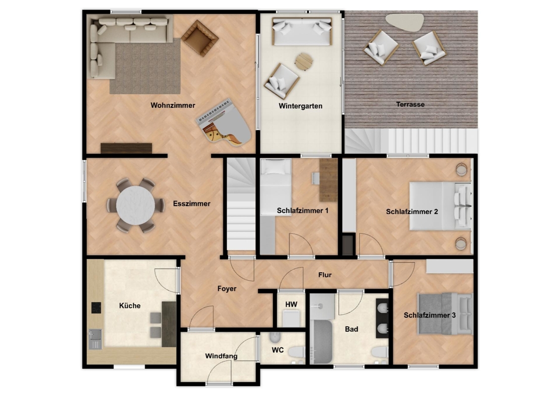 Die größere Einheit bietet ein beeindruckendes Wohnkonzept: Ein repräsentatives Foyer mit Gäste-WC, eine separate Küche, ein großzügiges Esszimmer sowie ein Wohnzimmer mit angrenzendem Wintergarten. Die sonnige Terrasse, der weitläufige Garten mit überdachter Außenküche und Pool schaffen eine Oase der Erholung. Drei Schlafzimmer, ein Tageslichtbad mit Dusche und Wanne sowie ein praktischer Abstellraum komplettieren das Raumangebot.